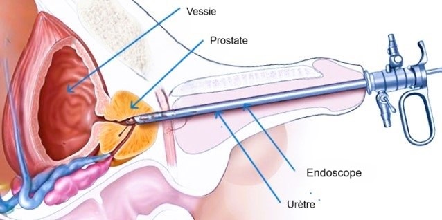 L’excès de tissu prostatique responsable de l’obstruction urinaire est réséqué par les voies naturelles ou vaporisé au laser. Le chirurgien utilise un endoscope introduit dans l’urètre jusqu’à la vessie. (Voir Schéma)