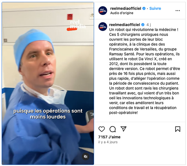 En cliquant sur l’image regardez sur l’Instagram de Reel Media une vidéo présentant le robot Da Vinci X de la clinique des Franciscaines